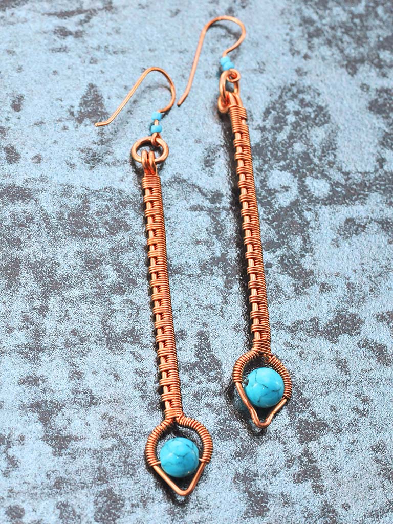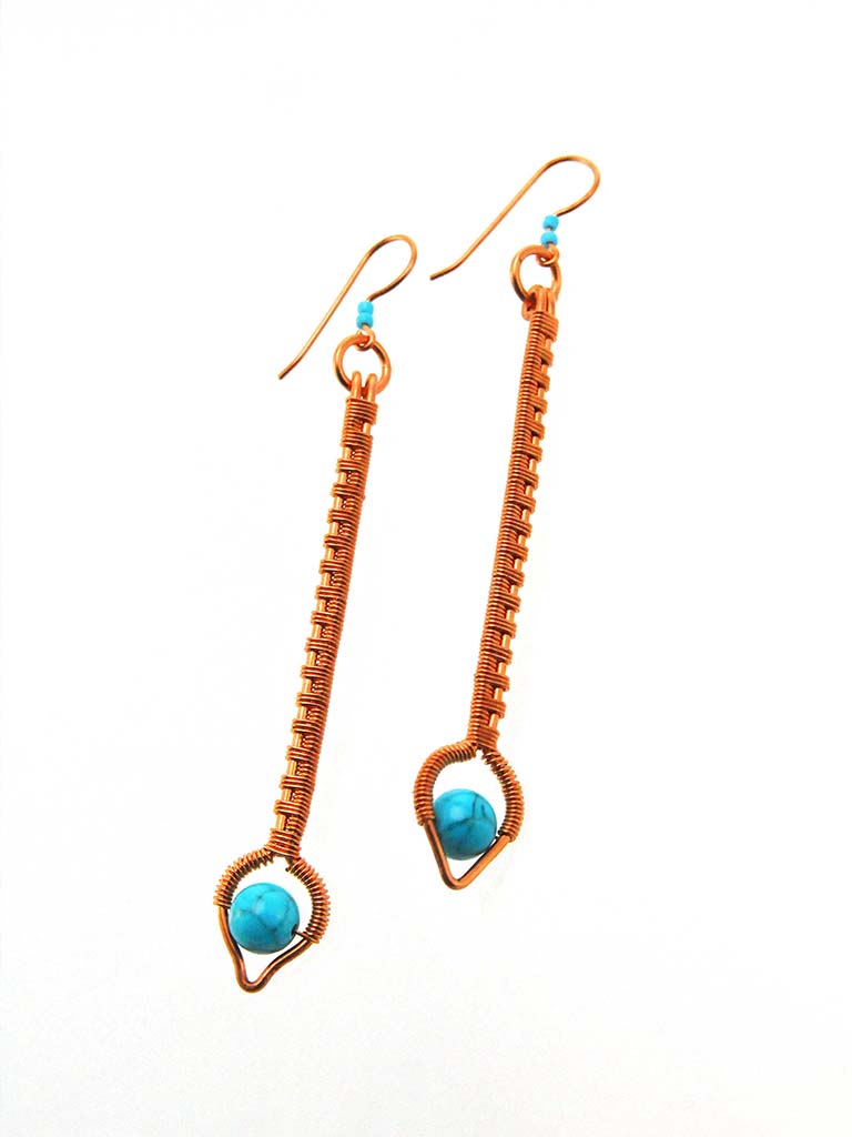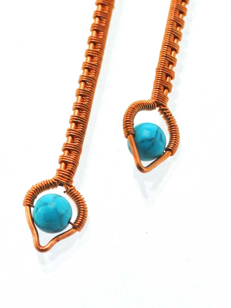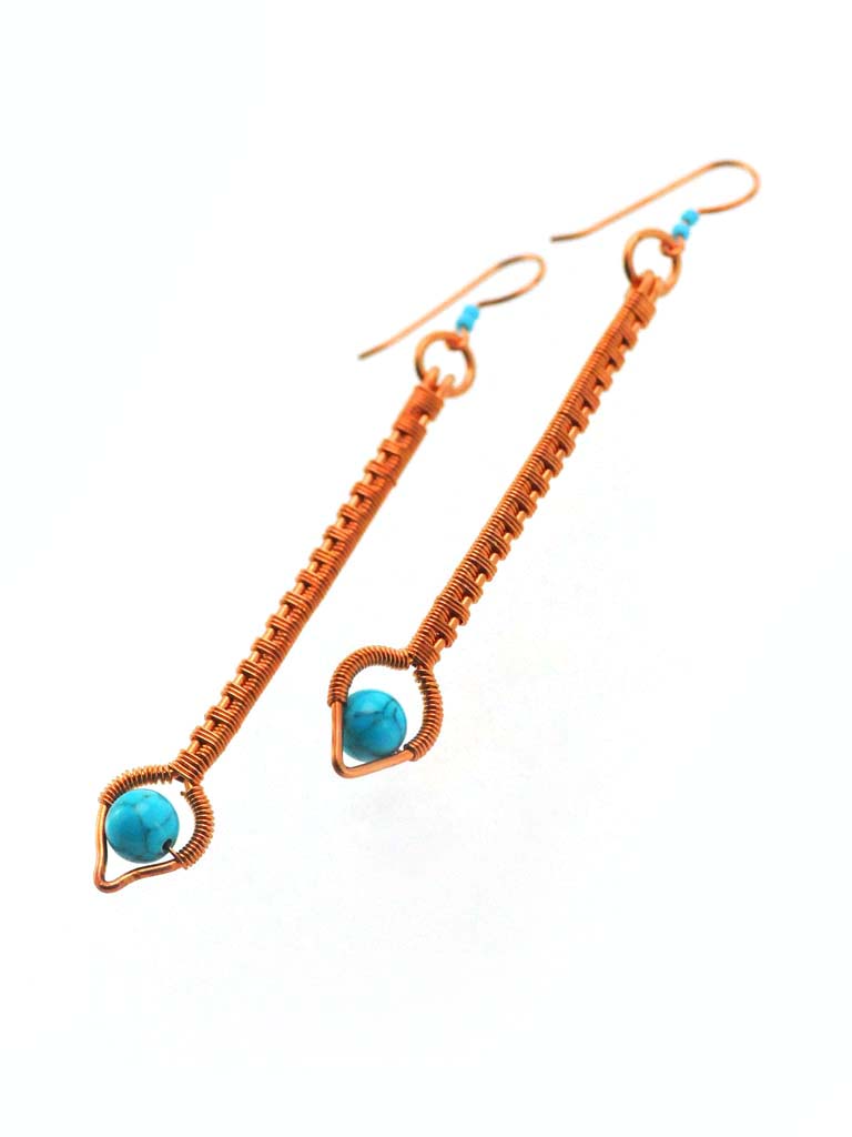 Elegantly stunning minimal earrings featuring Turquoise beads with copper wire that has been hand shaped and then weaved to create these exquisite earrings. On handcrafted copper ear wires.